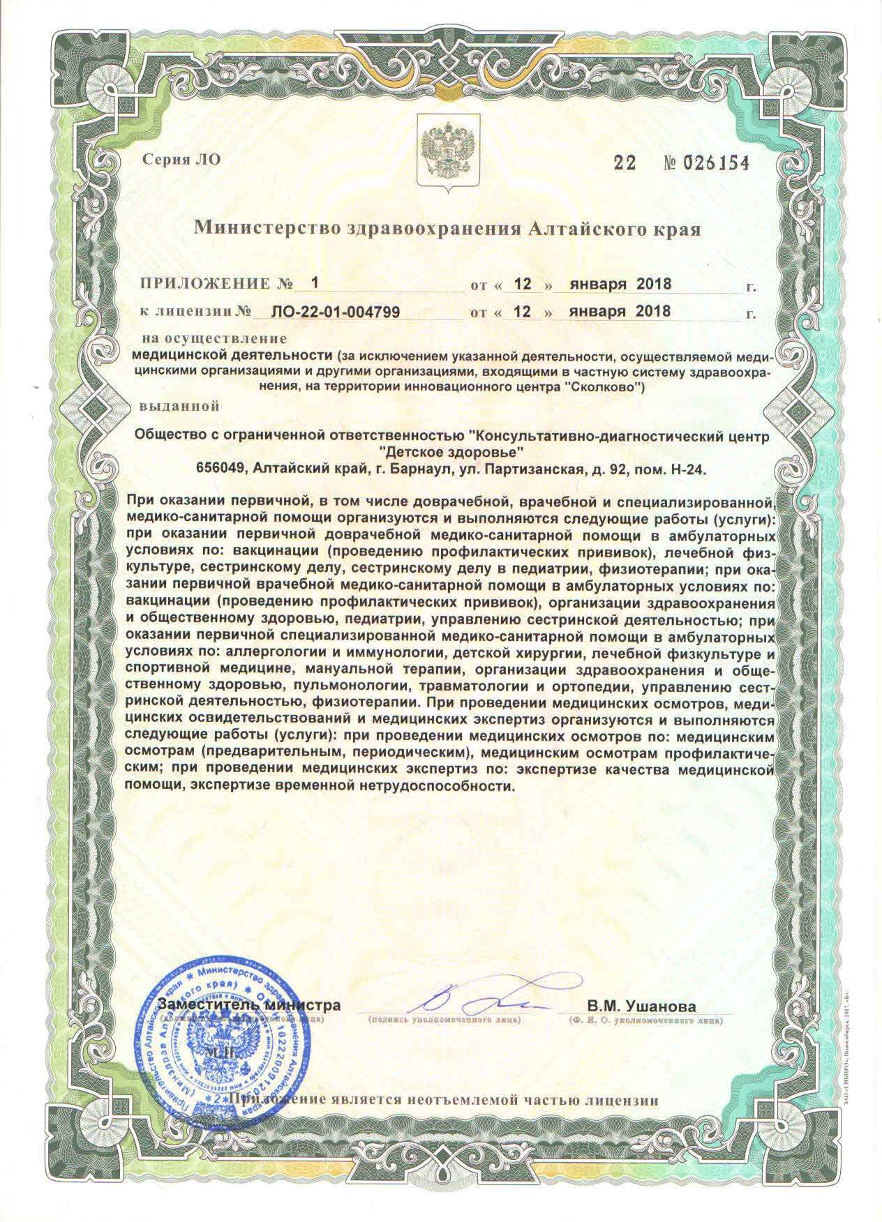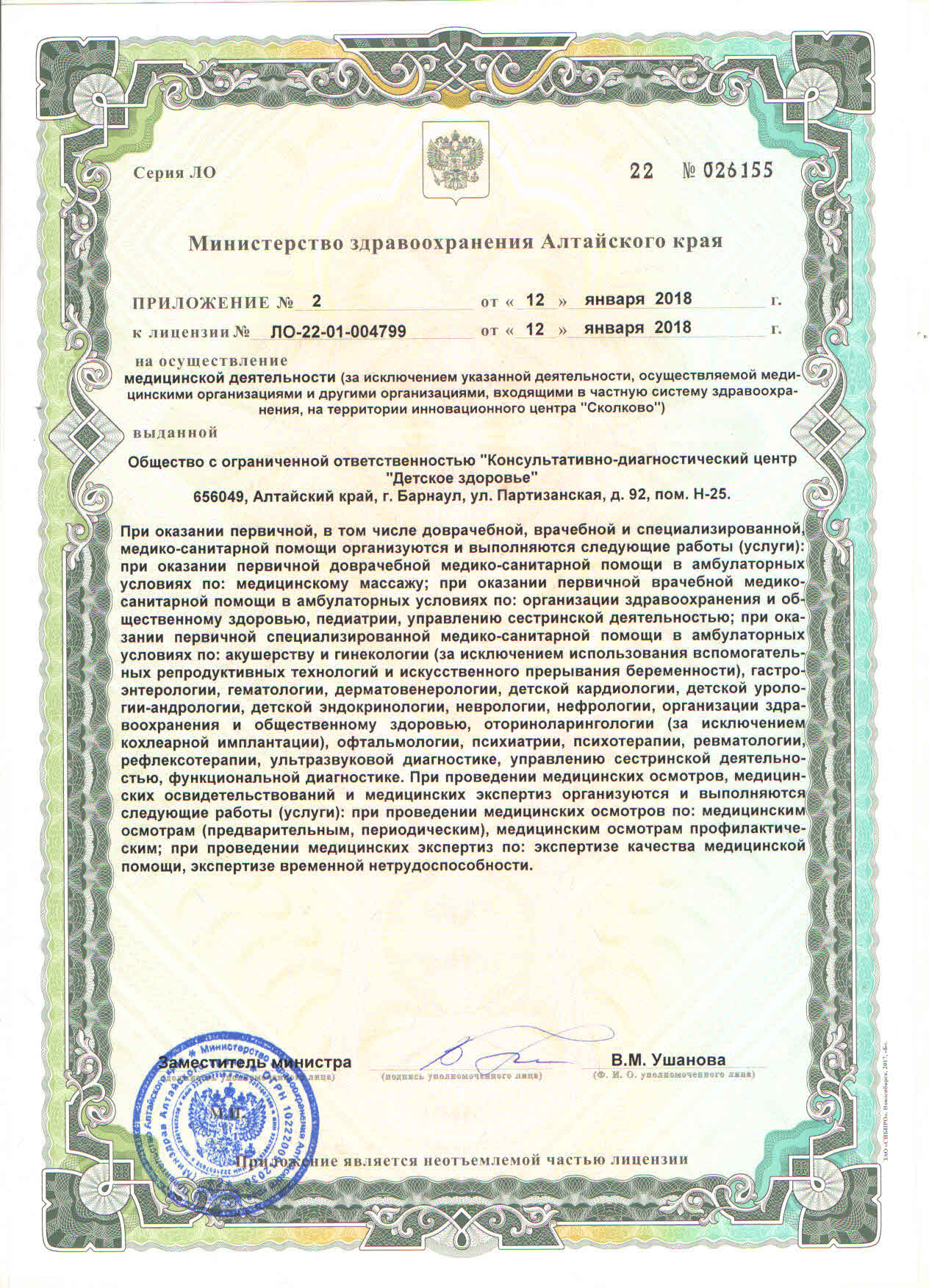 Сейчас в наших клиниках работают более 100 ведущих специалистов, в том числе высших квалификационных категорий, приём ведётся по 38 лечебным направлениям. Более 2 000 анализов, лабораторных исследований. Более 50 видов УЗИ диагностик. Вакцинация.